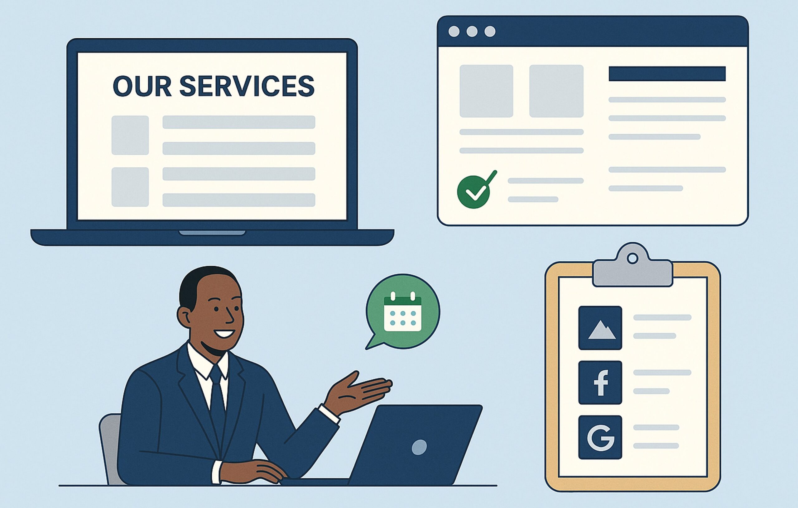 - Strong CTA (“Book a consultation” / “Schedule a discovery call”)